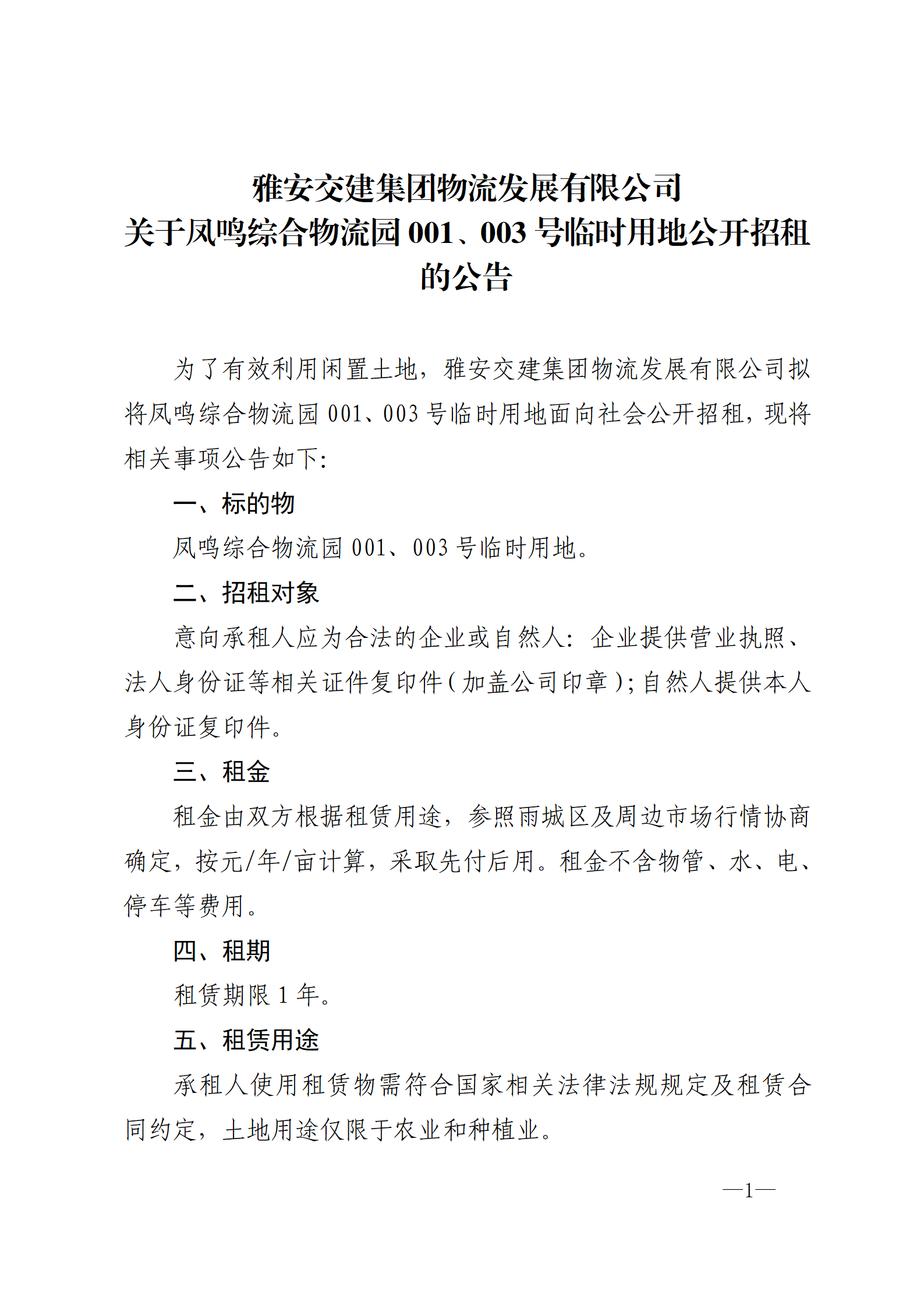 雅安交建集團(tuán)物流發(fā)展有限公司 關(guān)于鳳鳴綜合物流園001、003號(hào)臨時(shí)用地公開招租的公告
