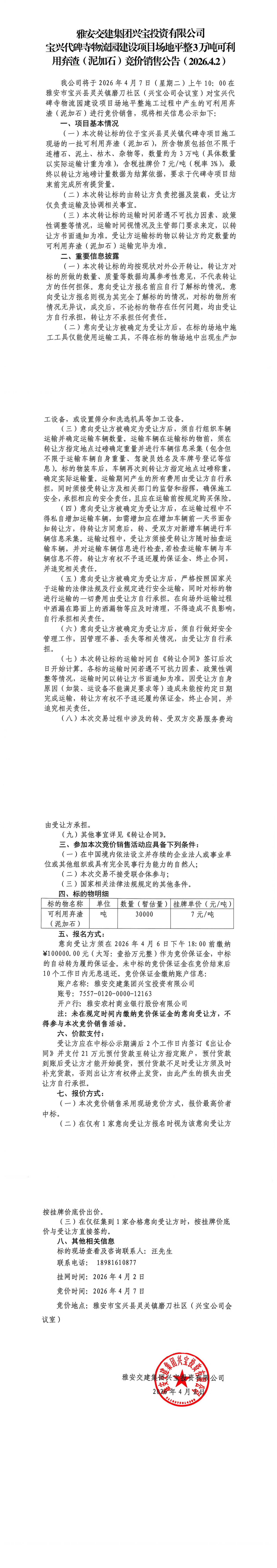 雅安交建集團興寶投資有限公司 寶興代碑寺物流園建設(shè)項目場地平整3萬噸可利用棄渣(泥加石)競價銷售公告